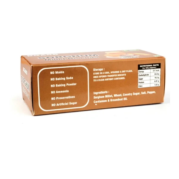 Crunchy biscuits made with pure sorghum millet, mixed grains, and natural sweeteners. Free from maida, baking agents, and artificial additives.